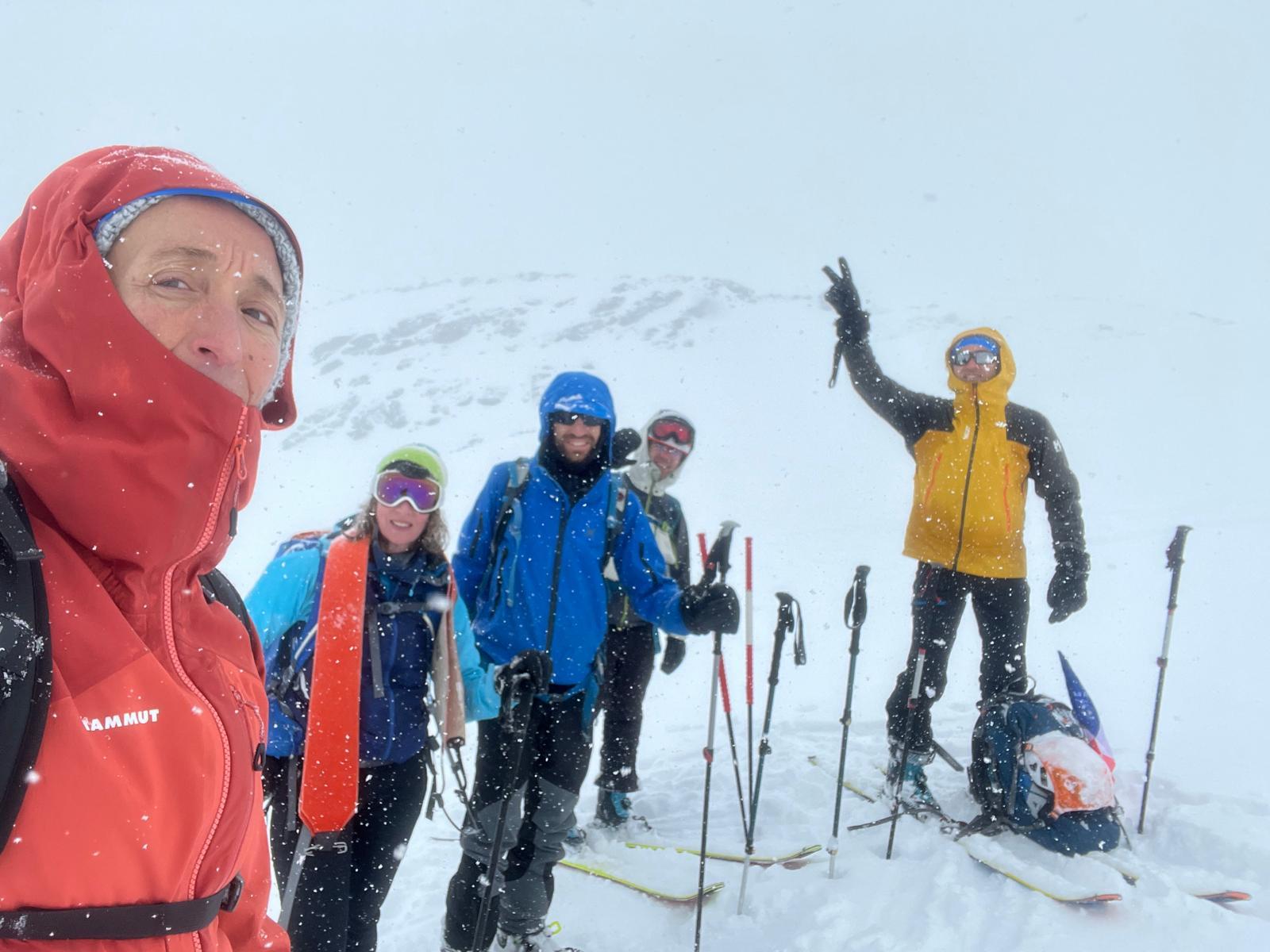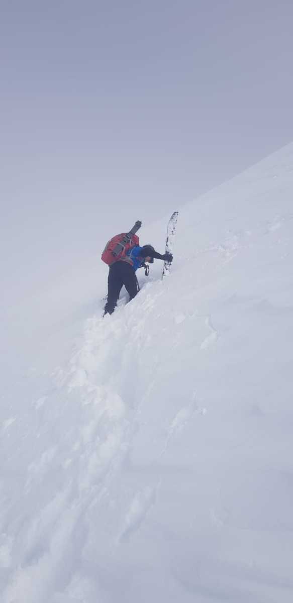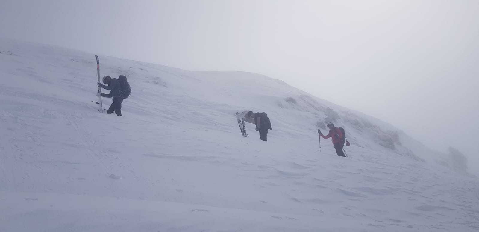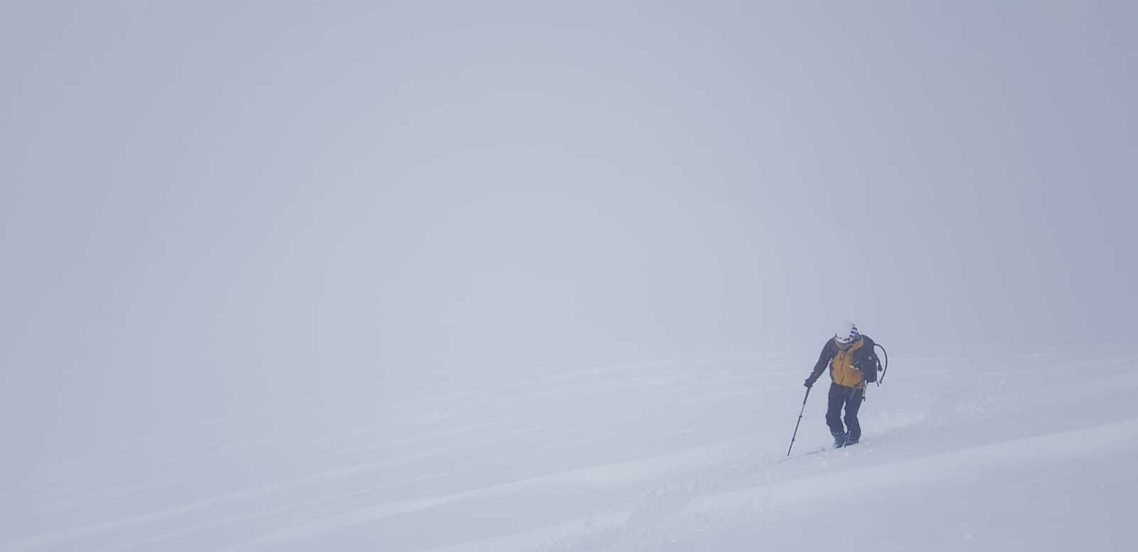 Neige continue, froid, peaux qui n’adhèrent plus, portage, couteaux, un surfeur qui disparaît, jour blanc…